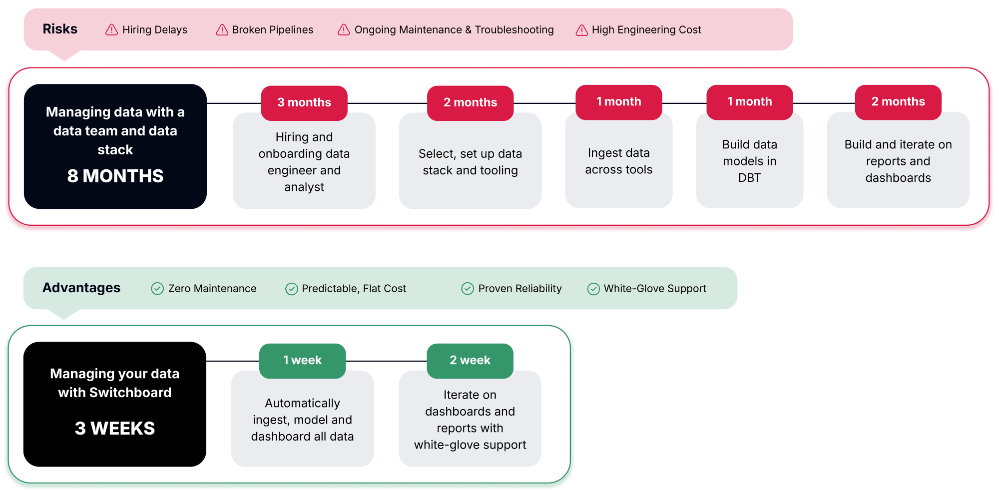 “Switchboard has been a game changer for our team. Within a few days we had all of our data centralized in one easy-to-use platform. By leveraging Switchboard, we’re able to make decisions faster and unlock new areas for growth without having to hire a data team or pay for endless tools”